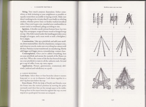 Pen and ink illustrations were commissioned for two books published by Profile Books. The first, Sea Fever, by Meg and Chris Clothier, featured drawings of charts and knots. The second, Country Matters, by Meg and Jonny Clothier, showed illustrations of types of tree maintenance and bonfire building.